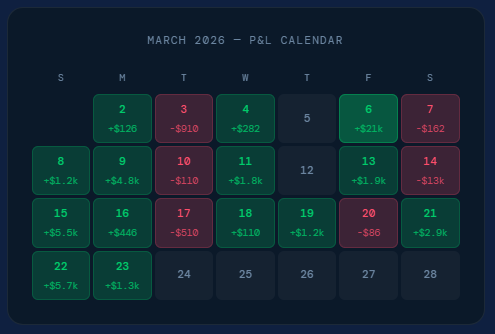 Color-coded monthly calendar view gives you an instant visual overview of your trading performance day by day.
